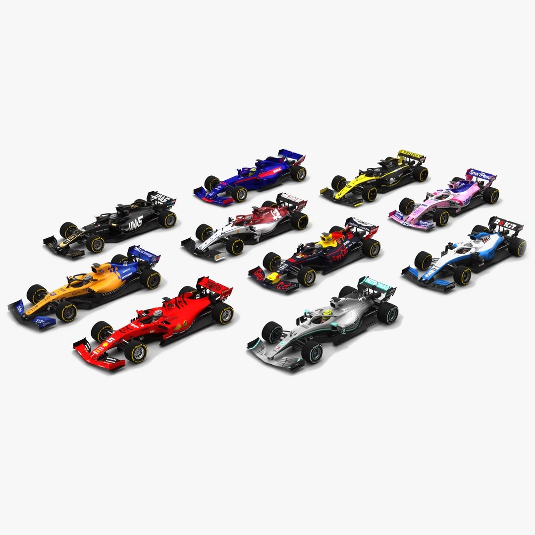 Pack of 10 low-poly subdivision-ready Formula 1 Season 2019 Race Car Collection 3D models with PBR materials (Specular and Metallic workflows), based on the F1 season 2019: