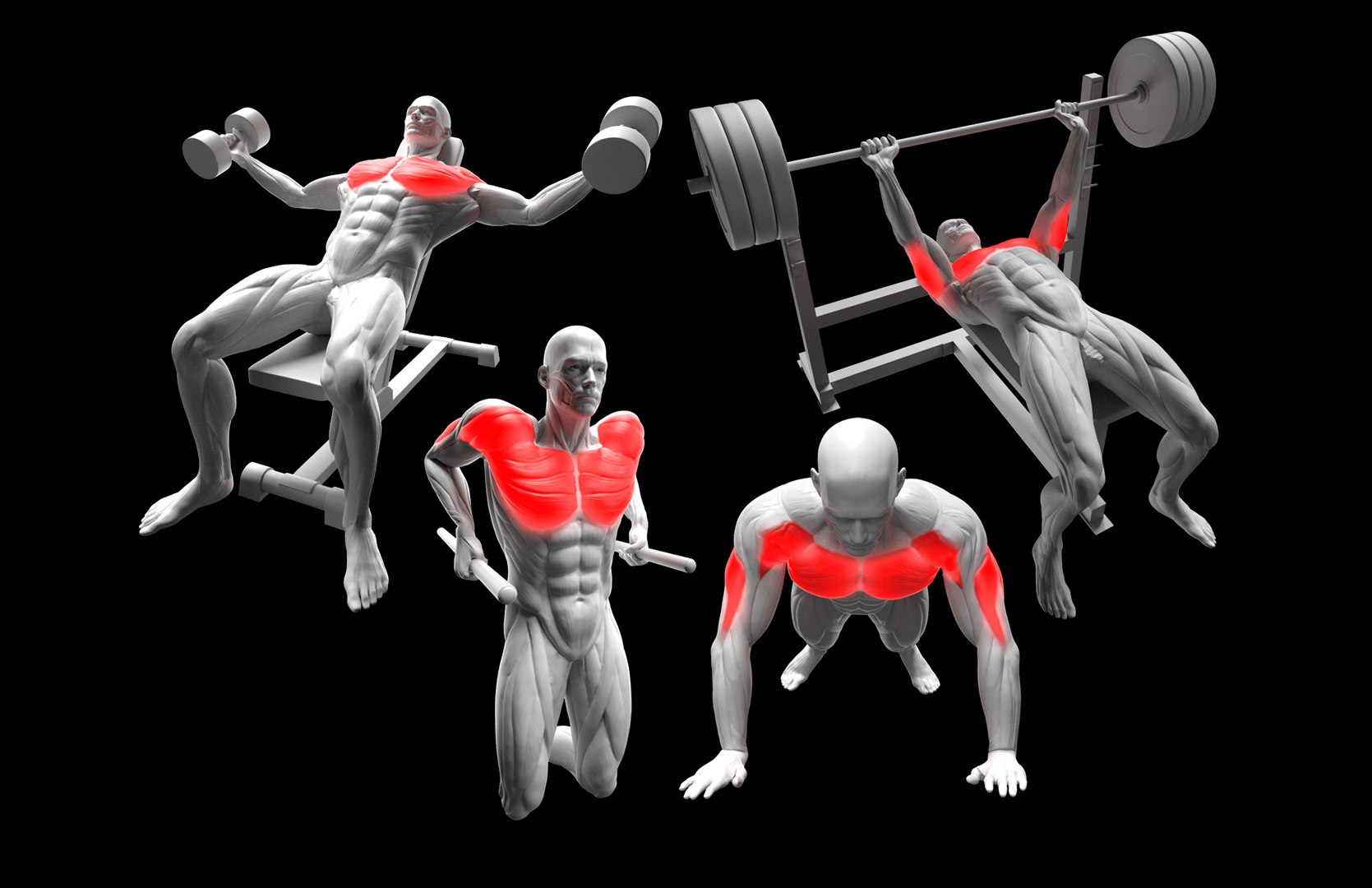 Chest Exercises Pack - Dumbbell Flyes - Bar Dips - Push Ups - Bench Press