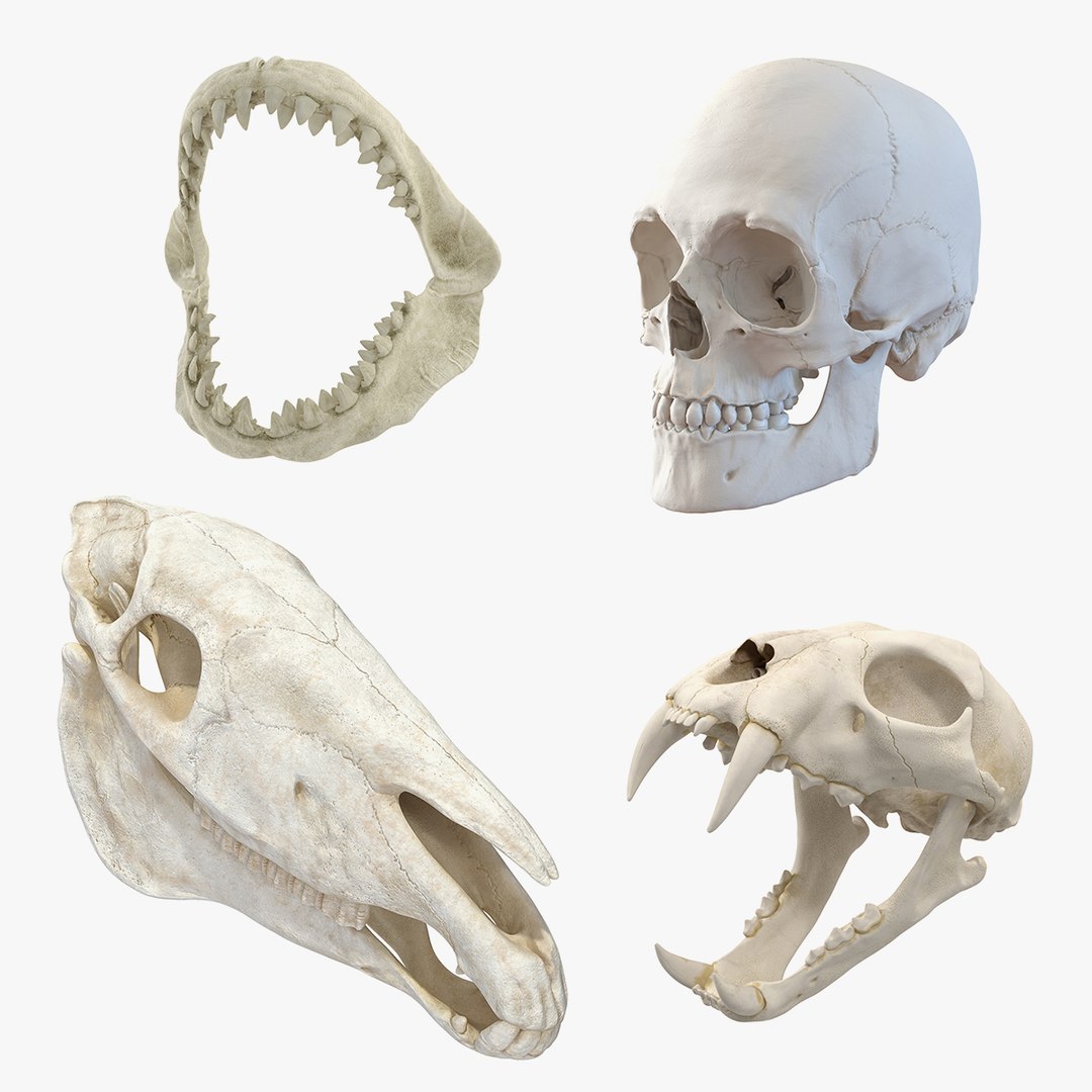 Skulls Collection 2 with Male Human Skull, Bengal Tiger Skull, and Horse Skull.