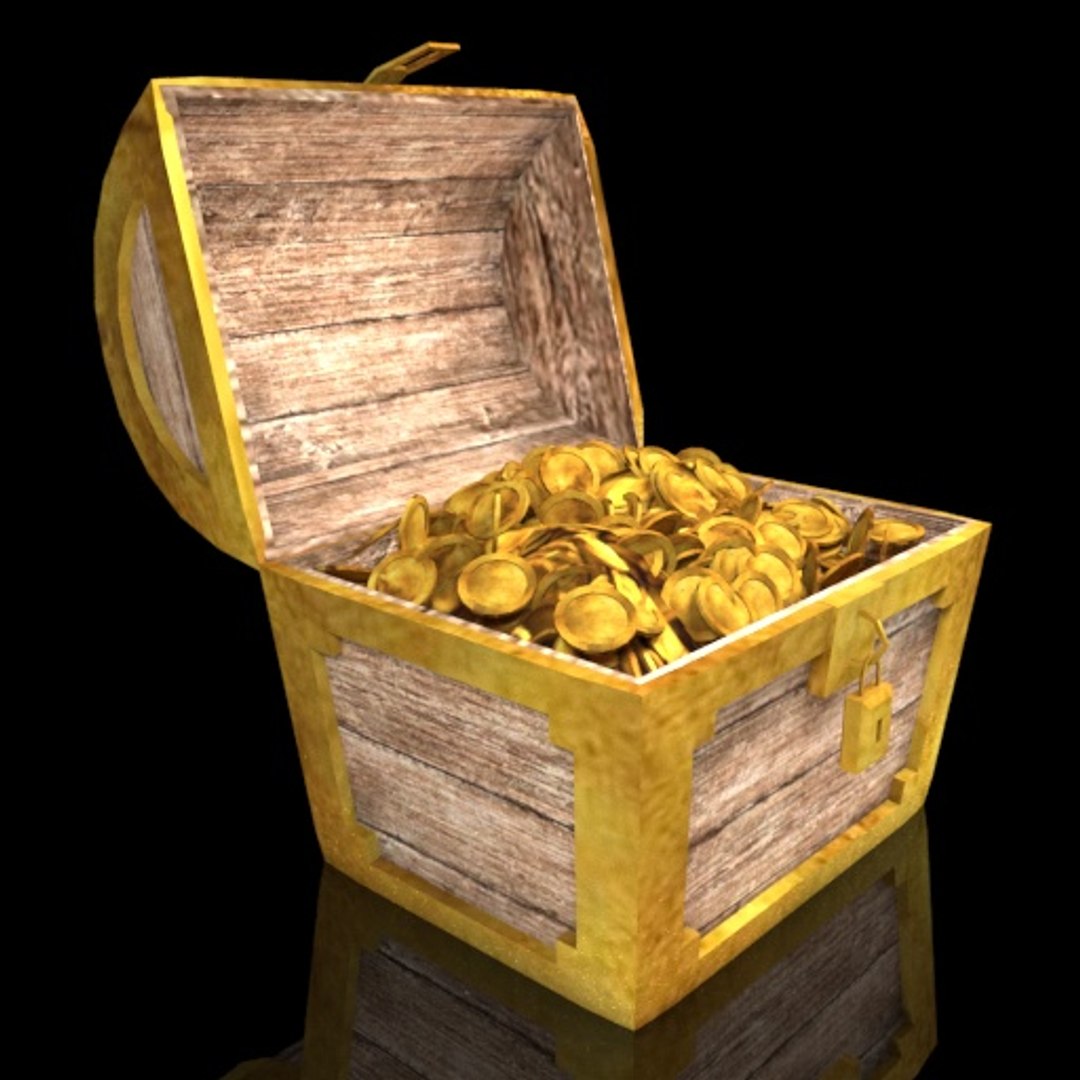 A 3d model of a treasure chest filled with golden coins.